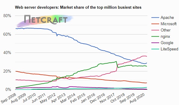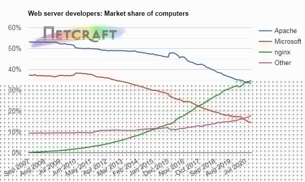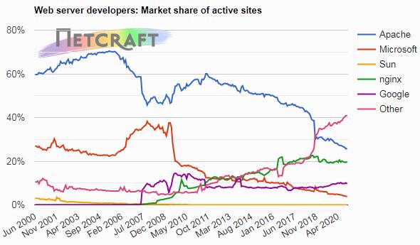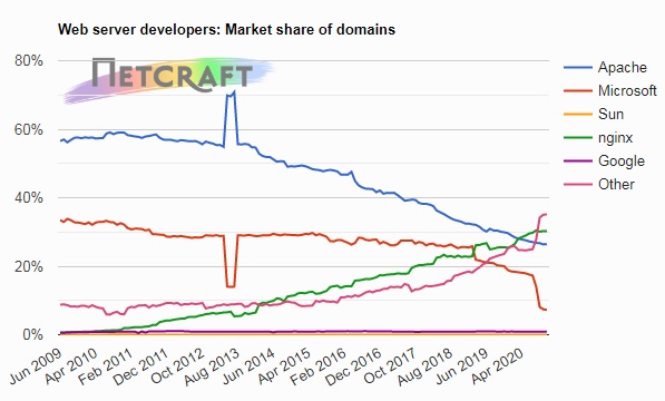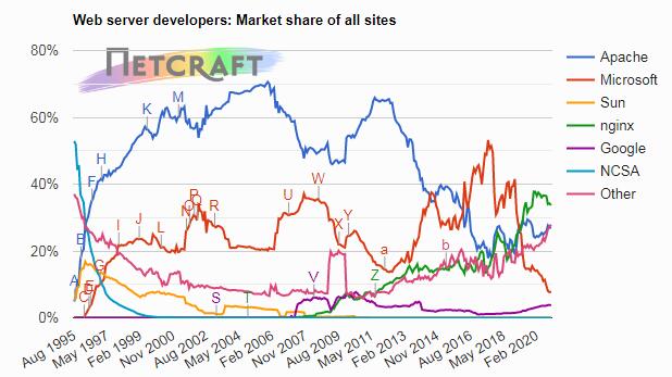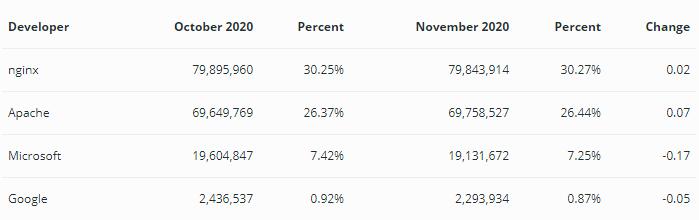 Netcraft 刚刚分享了 2020 年 11 月的 Web 服务器调查数据,可知与 10 月份相比,Nginx 开发者从 34.24% 下滑至 33.69%,但还是保住了总份额第一的位置。排名第二的 Apache 亦从 27.04% 下滑至 26.78%,同时微软从 7.66% 小幅增长至 7.91%,谷歌则从 3.86% 下滑至 3.71% 。