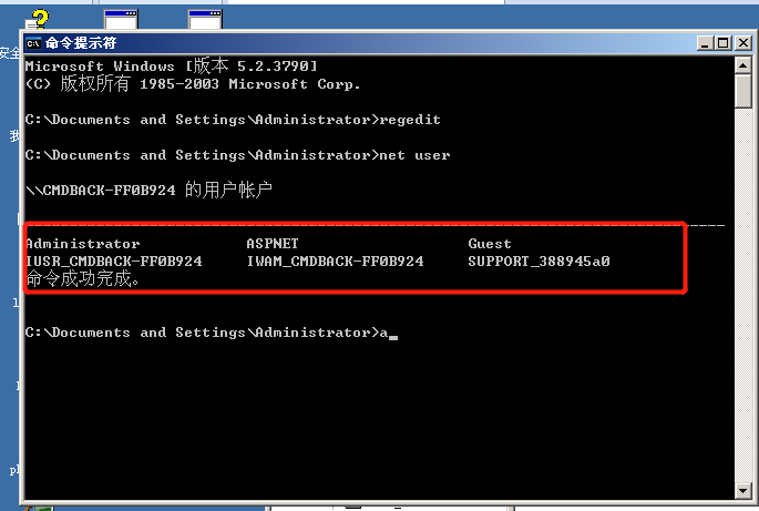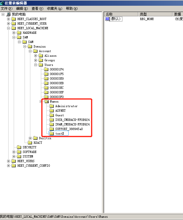 接下来就是查看系统是否存在其他恶意的管理员账号,cmd命令下输入net user就会列出当前服务器里的所有账号,也可以通过注册表去查看管理员账号是否被增加,注册表这里是需要在命令中输入egedit来打开注册表,找到HKEY_LOCAL_MACHINE\SAM\SAM\Domains\Account\Users\Names可以看到所有的账号名字。截图如下:
