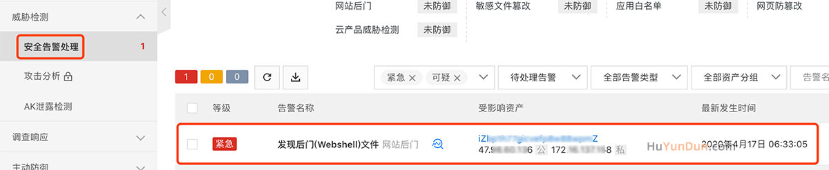 阿里云云盾云安全中心检测到服务器出现紧急安全事件,发现后门(Webshell)文件如何处理?护云盾分享阿里云服务器发现后门(Webshell)文件的解决方法: