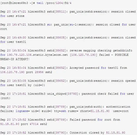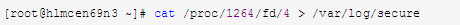 c.从上面的信息可以看到 PID 1264(rsyslogd)打开文件的文件描述符为4。同时还可以看到/var/log/ secure已经标记为被删除了。因此我们可以在/proc/1264/fd/4(fd下的每个以数字命名的文件表示进程对应的文件描述符)中查看相应的信息,如下: