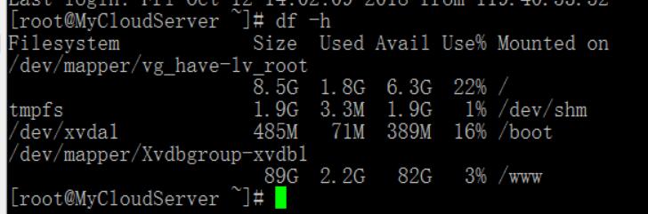 本人习惯上来先来一个DF -H 查看现在的数据盘目录是哪个。哈哈