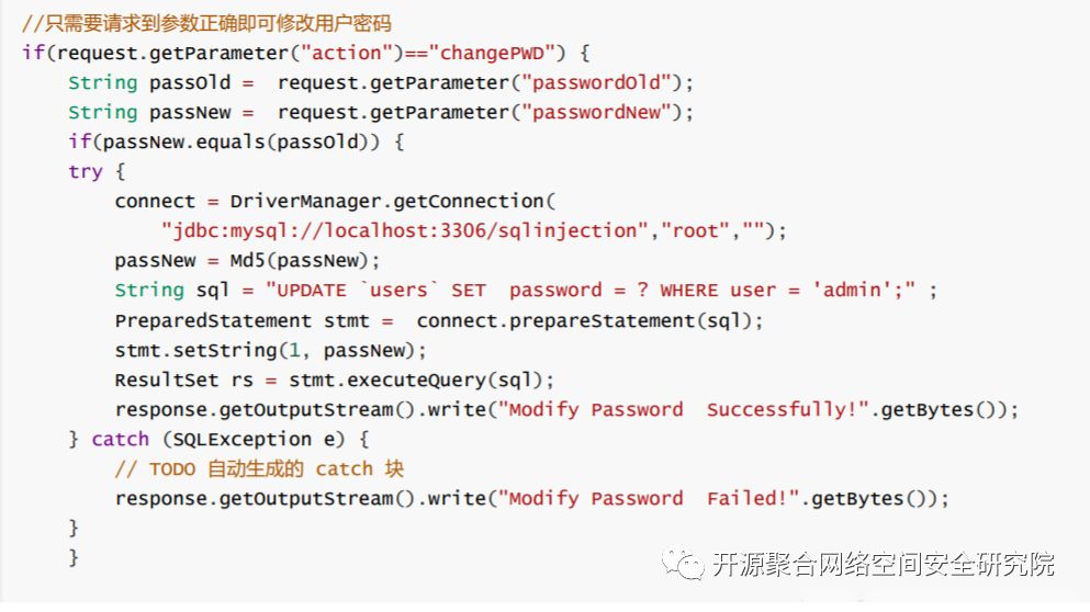 代码中接收用户提交的参数“passwordOld、passwordNew”,之后修改了该用户的密码,一旦接收到一个用户发来 的请求,就执行此操作。