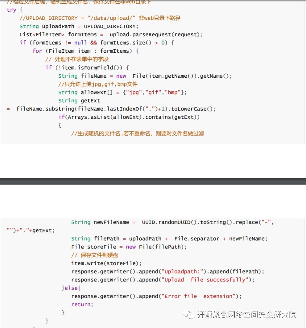 2. 上传文件的目录必须是http请求无法直接访问到的。如果需要访问的,必须上传到其他(和web服务器不同 的)域名下,并设置该目录为不解析php、jsp等脚本语言的目录;