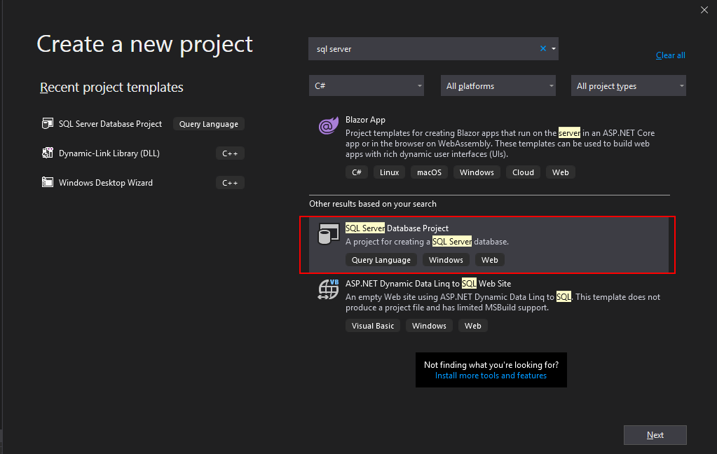 首先,在 visual studio 中创建一个 SQLSever 项目