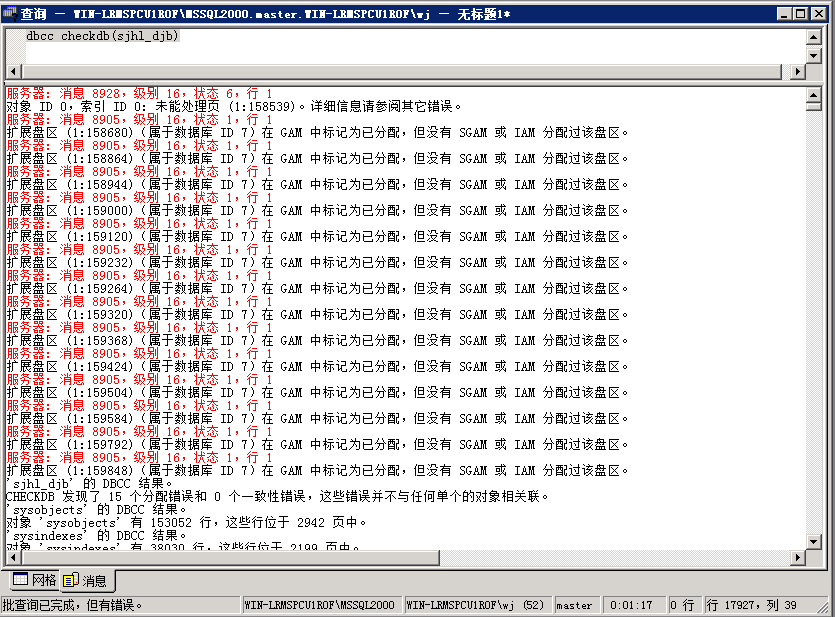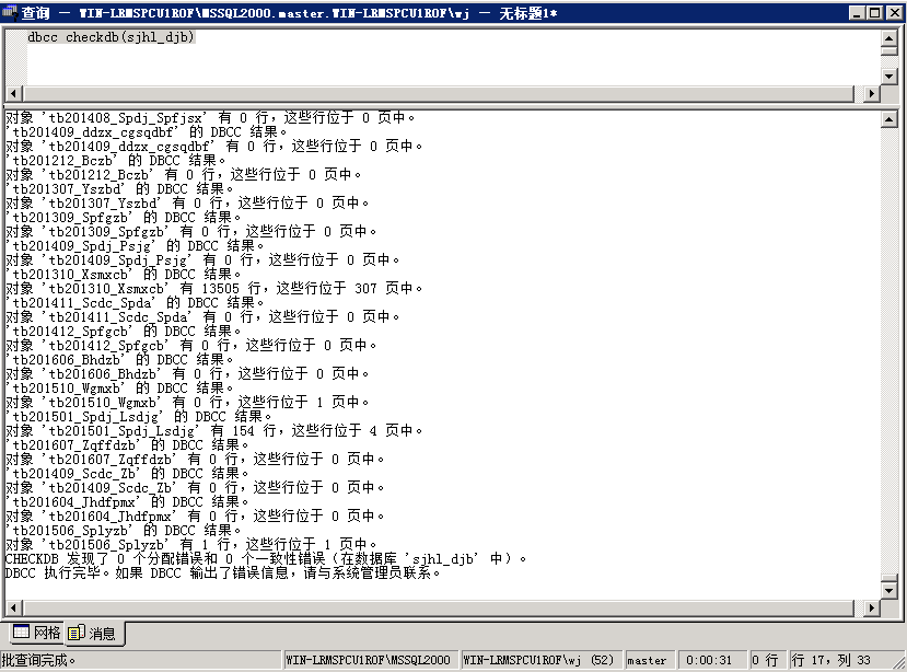 我们再次进行dbcc检测数据库后发现已经没有任何错误提示,重新附加数据库,没有出现任何报错,附加数据库成功。通过正常的数据库环境对数据库进行查询、验证,最终可以确认所有数据被完整恢复。数据库修复成功。