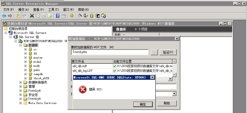 第一步:尝试附加数据库,修复数据库,可以看下面的图片,我们对数据库进行附加后提示“823”错误。