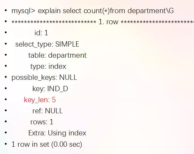 而里面有一个指标key_len是大家相对容易忽略的,它是有一套自己的计算法则,比如根据数据类型,是否允许为null,如果是varchar类型,需要额外补充2个字节,那么如果字段为depart_id int(11),depart_name varchar(20),字符集为gbk,则key_len为5是4+1的结果,而如果选择了字段depart_name则是20*2+1+2=43