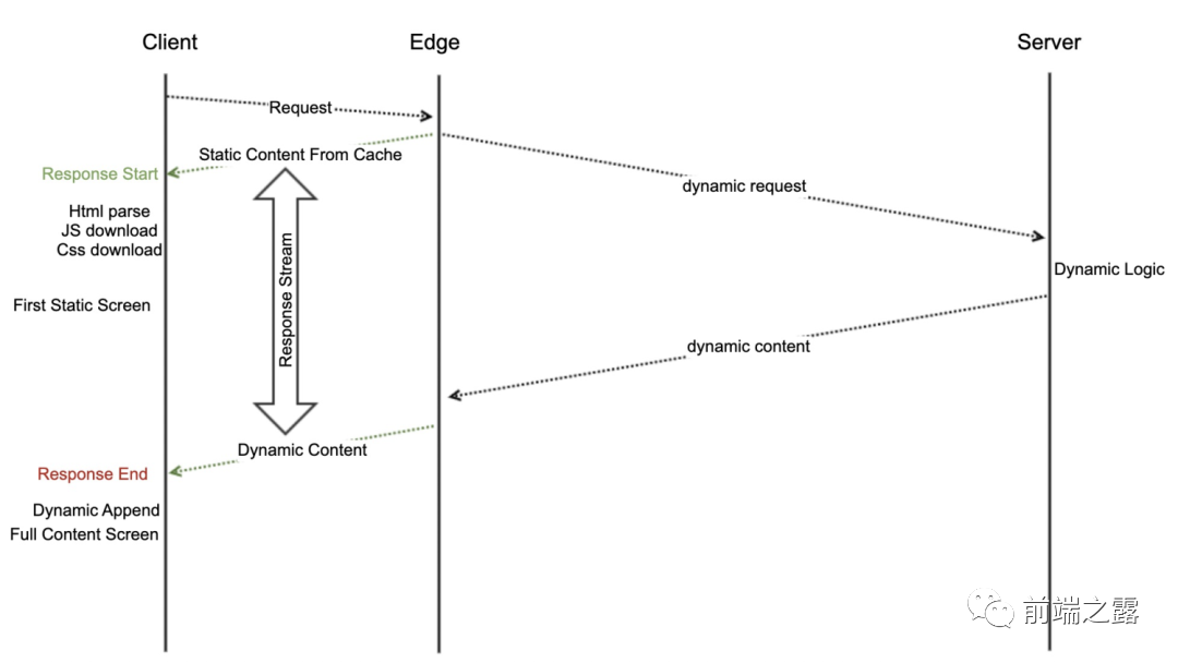CDN 比服务端距离用户更近,有更短的网络延时。在CDN云加速节点上将可缓存的页面静态部分先快速返回给用户,同时在CDN节点上发起动态部分内容请求,并将动态内容在静态部分的响应流后,继续返回给用户。